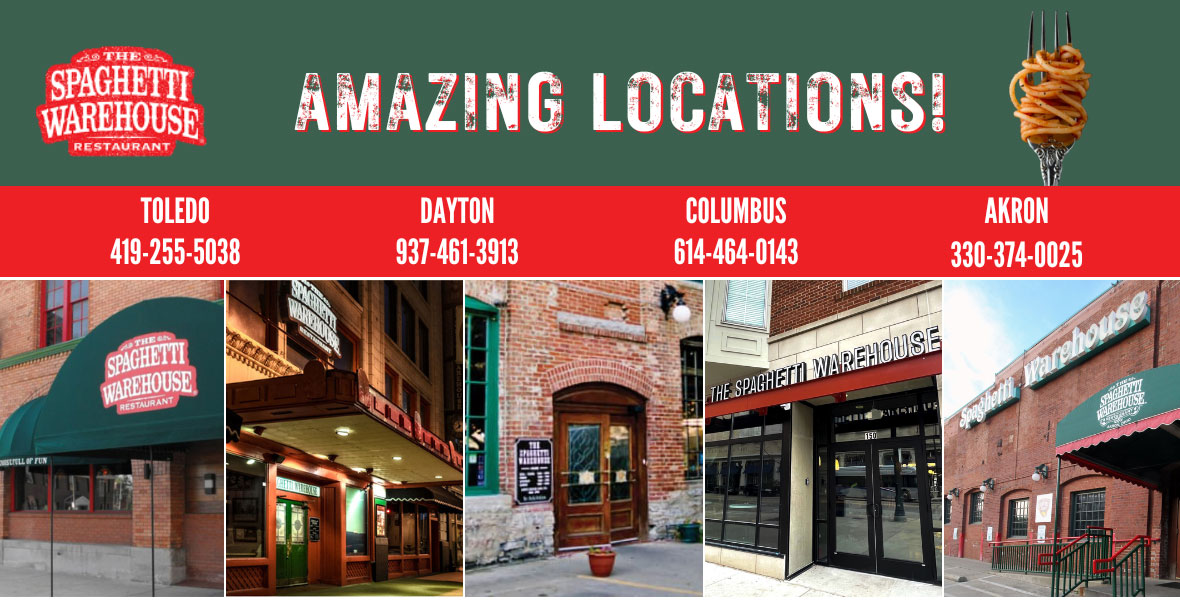Since 1972 it has been our pleasure to celebrate joyous happenings like birthdays, anniversaries, weddings, graduations, reunions, promotions or just a night out with family and friends at our family-friendly American-Italian restaurant, Spaghetti Warehouse. Come let us celebrate life with you.